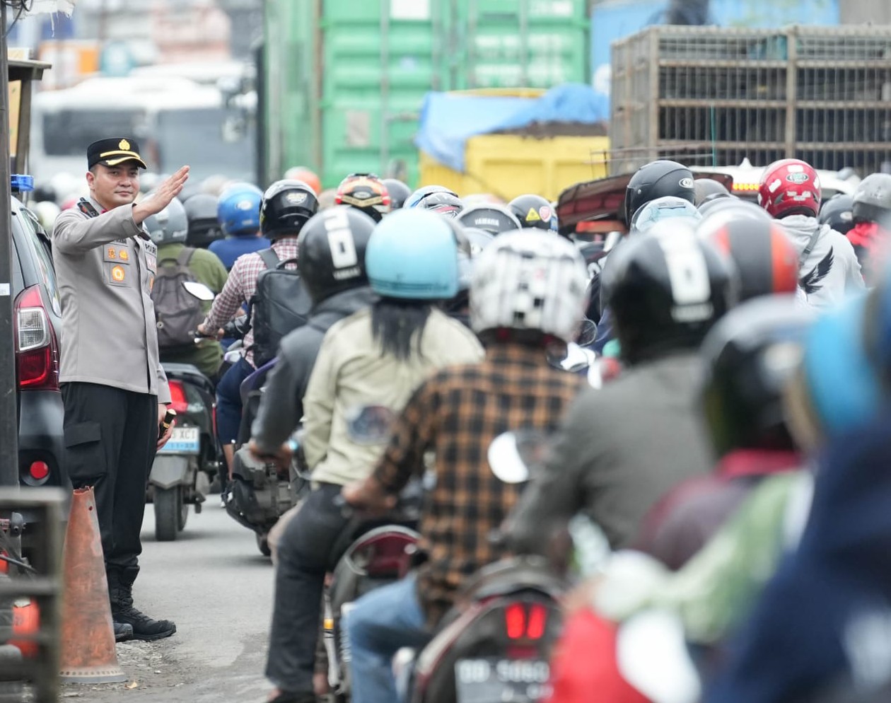 Dalam pengaturan lalu lintas tersebut, Kapolres tidak segan membantu personel menghentikan kendaraan dan mengarahkan arus, serta memberikan imbauan kepada para pengendara agar tetap tertib dan mematuhi aturan berlalu lintas.