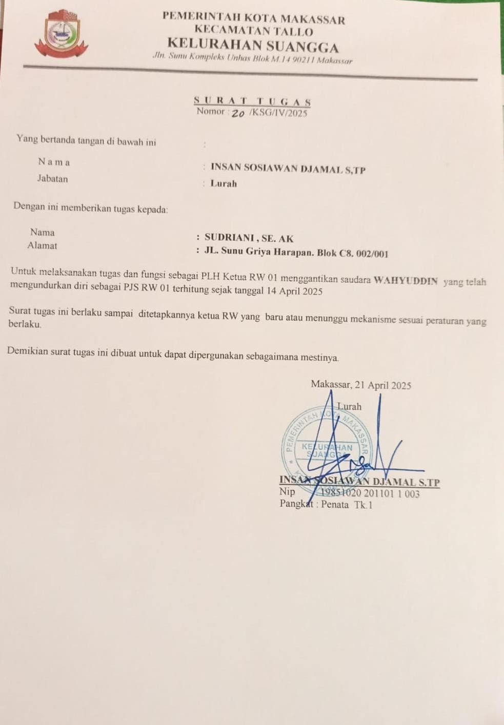 Dimana sebelum surat tugas di keluarkan untuk PLH. Wahyuddin selaku Pjs Ketua RW 01 resmi mengundurkan diri pada tanggal 14 April 2025,” kata Lurah Rabu (23/4/2025)