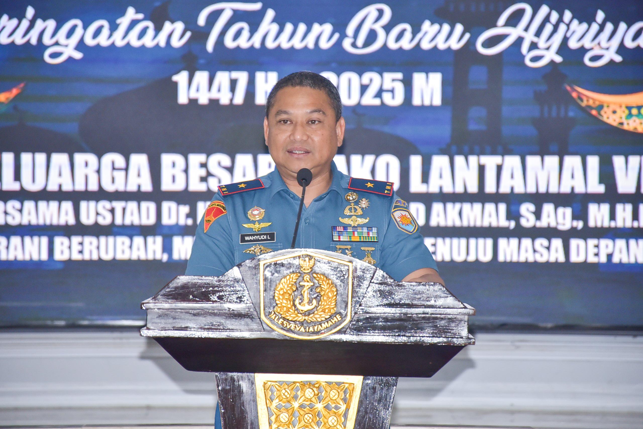 Makassar,lontaracelebes.id–Komandan Lantamal VI (Danlantamal VI) Makassar Brigadir Jenderal TNI (Mar) Dr. Wahyudi, S.E., M.Tr.Hanla., M.M., M.Han., beserta Ketua Korcab VI Daerah Jalasenastri Armada II (DJA II) Ny. Afrina Amalia Wahyudi menghadiri peringatan Tahun Baru Islam 1447 H/2025 M dengan tema “Hijrah, Berani Berubah, Menjaga Amanah dan Perkuat Ukhuwah Menuju Masa Depan Penuh Berkah” bertempat di Gedung Hasanuddin Mako Lantamal VI, Rabu (30/07/2025).