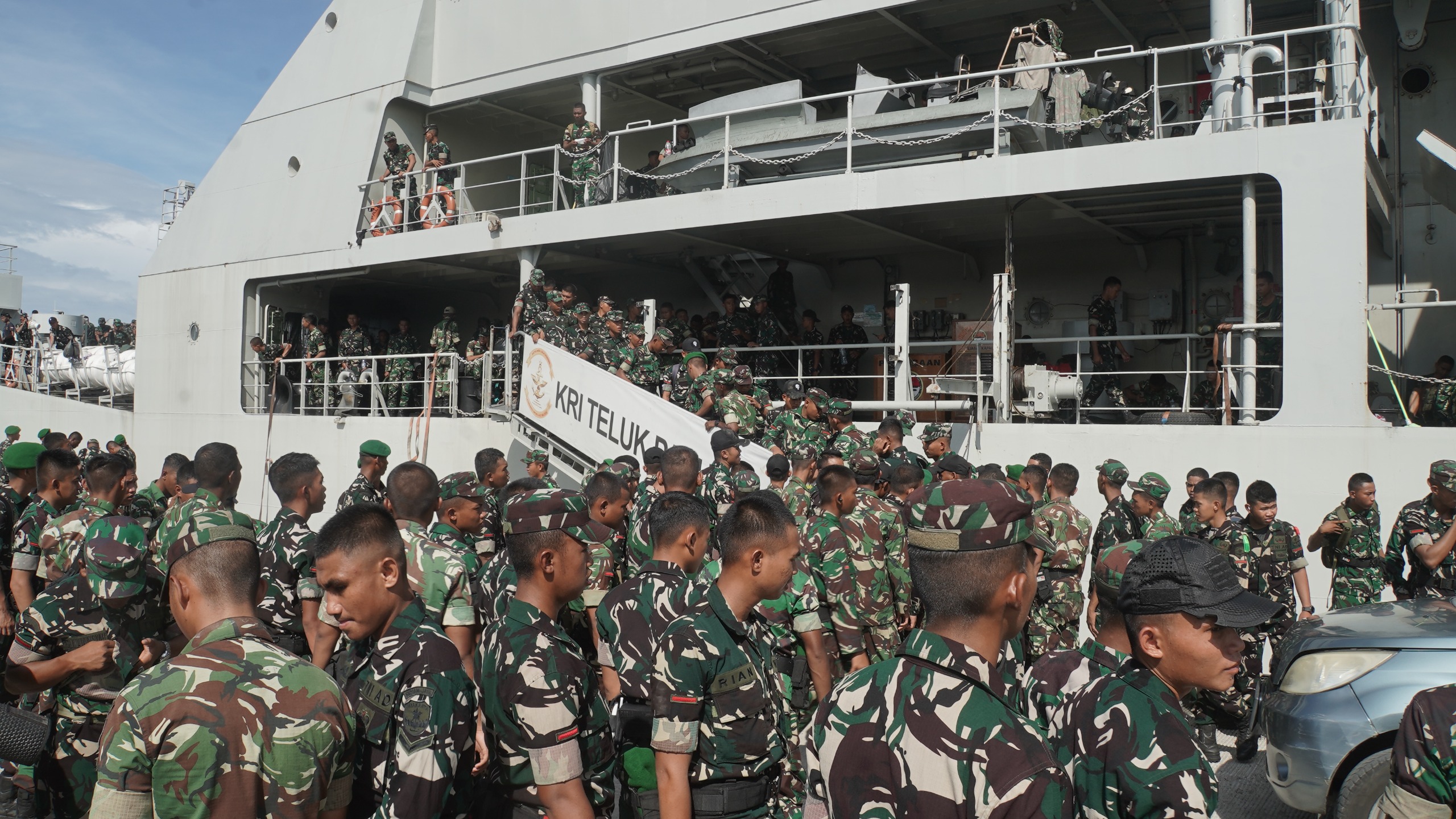 Suasana di dermaga pagi itu penuh haru dan kebanggaan. Isak tangis keluarga yang melepas keberangkatan suami, anak, dan saudara mereka berpadu dengan semangat pantang menyerah khas prajurit. Di tengah lambaian tangan dan derap langkah yang tegas, tergambar jelas ketabahan dan keikhlasan keluarga besar TNI dalam mendukung pengabdian anak bangsa untuk menjaga keutuhan dan kedaulatan Negara Kesatuan Republik Indonesia.