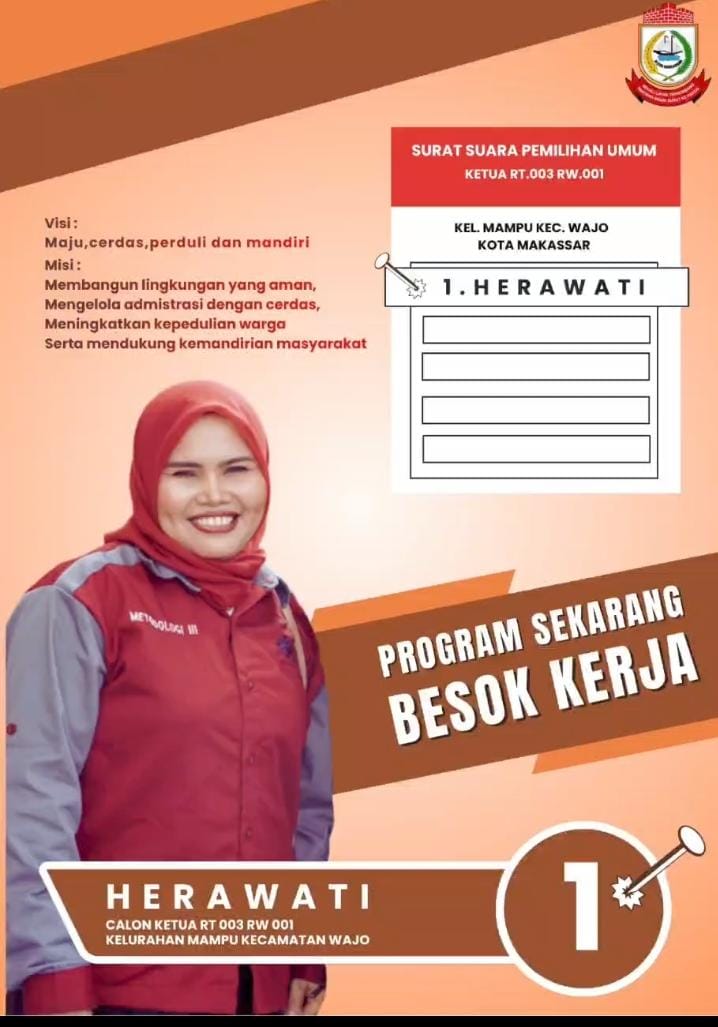 Hingga kini dukungan dari kalangan hingga warga terus mengalir bahwa dirinya mampu menjadi seorang pemimpin dan memiliki semangat untuk memajukan kesejahteraan jangan lupa tanggal 3 Desember 2025 Coblos No 1 Herawati Untuk ketua RT 001/RW 003 kelurahan Mampu kecamatan WAjo (**)